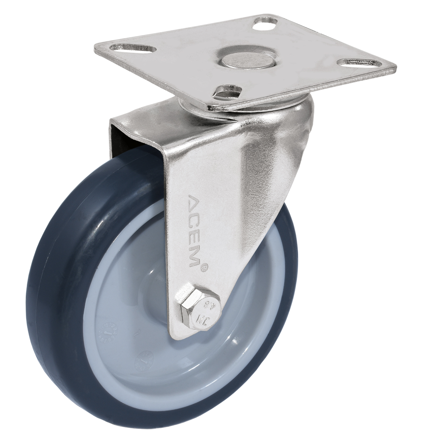 Roulette pivotante, fabriquée en caoutchouc thermoplastique (TPR), moulé sur un corps de roue en polypropylène. Chape en tôle d’acier embouti, finition zinguée, pivot sur double chemin de billes, moyeu de roue boulonné, fixation à platine.