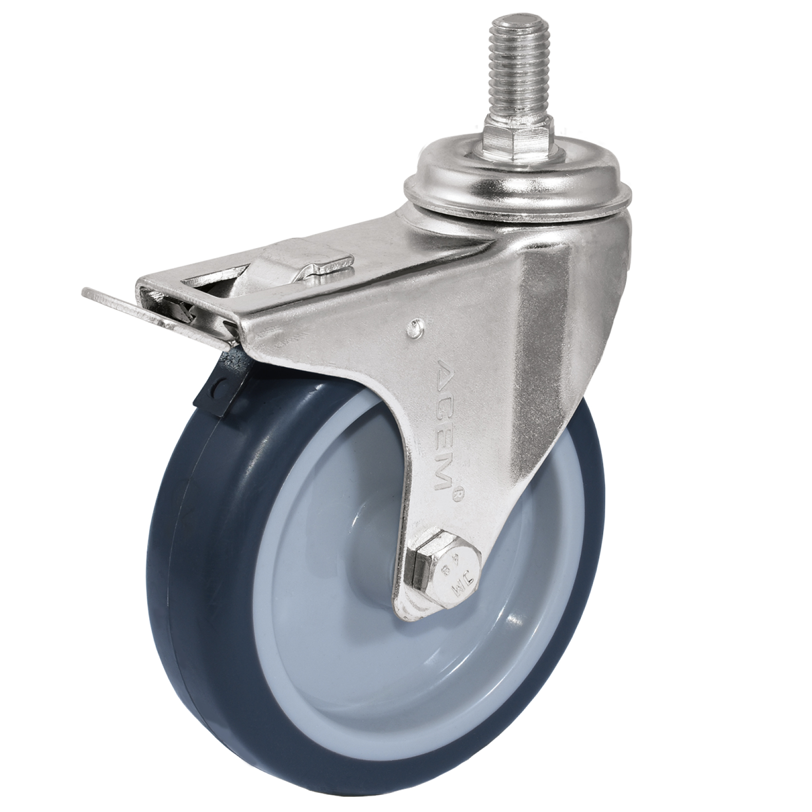 moulé sur un corps de roue en polypropylène. Chape en tôle d’acier embouti, finition zinguée,