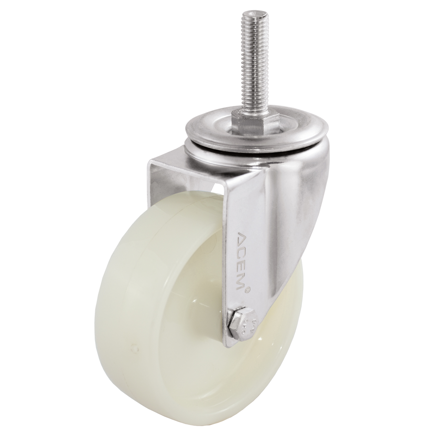 Roulette Pivotante, chape en acier embouti, finition zinguée, pivot sur double chemin de billes, axe de roue boulonné, joint de protection du pivot, fixation à tige.