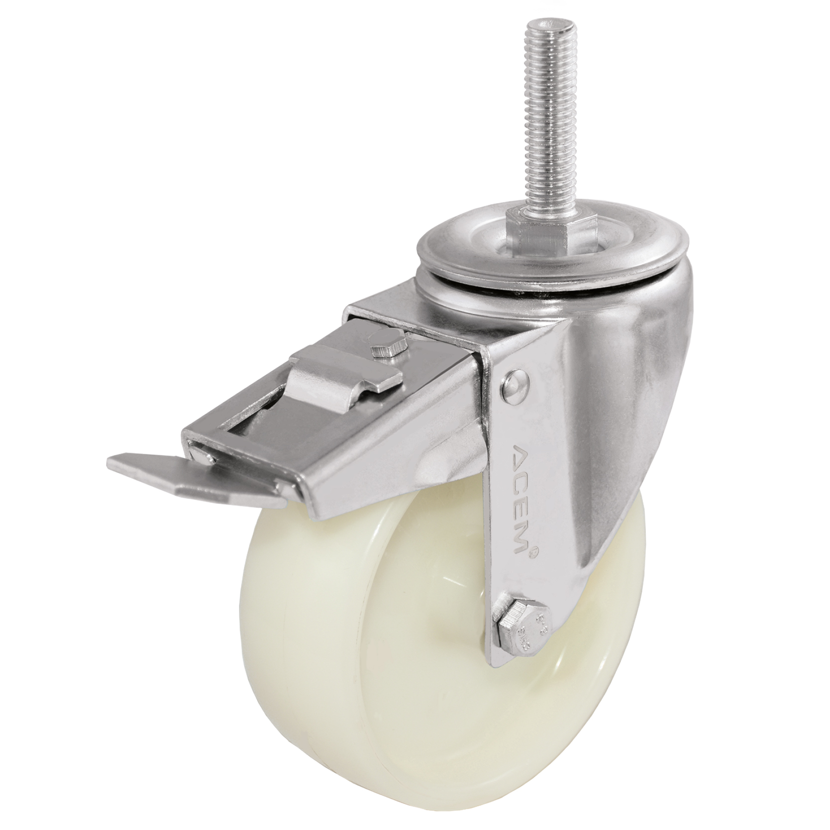 embouti, finition zinguée, pivot sur double chemin de billes, axe de roue boulonné, joint de protection du pivot, fixation à tige.