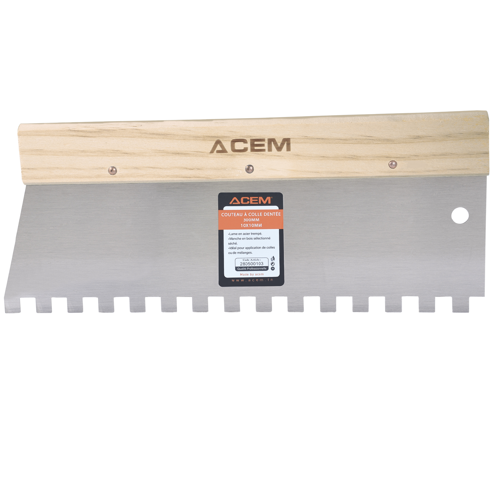 ■ Lame en acier verni. Manche en bois. Denture carrée fine.