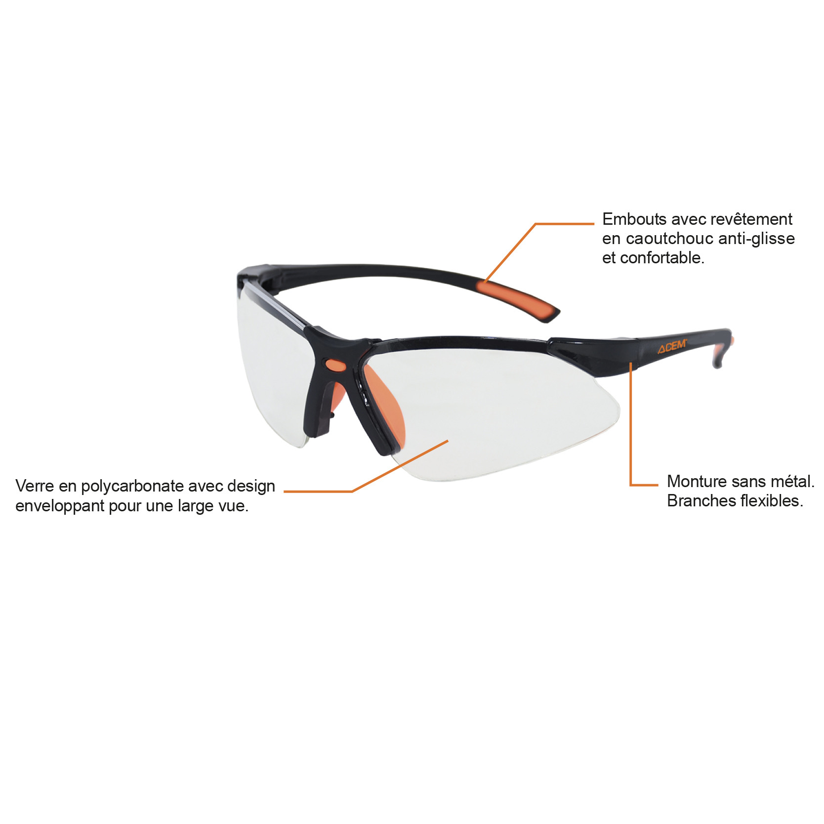 Lunettes de sécurité à demi-monture noire et oculaire en polycarbonate transparent pour convenir aux activités et aux cadres où un champ de vision intégral est important, voire essentiel et procurent un champ de vision dégagé. Traitement anti-rayures et antibuée.
