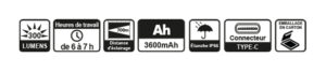 Lumens: Frontale 300 lm/Latérale 180 lm
