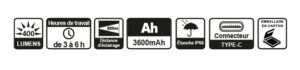 ■ Lumens: Frontale 400 lm/Latérale 180 lm