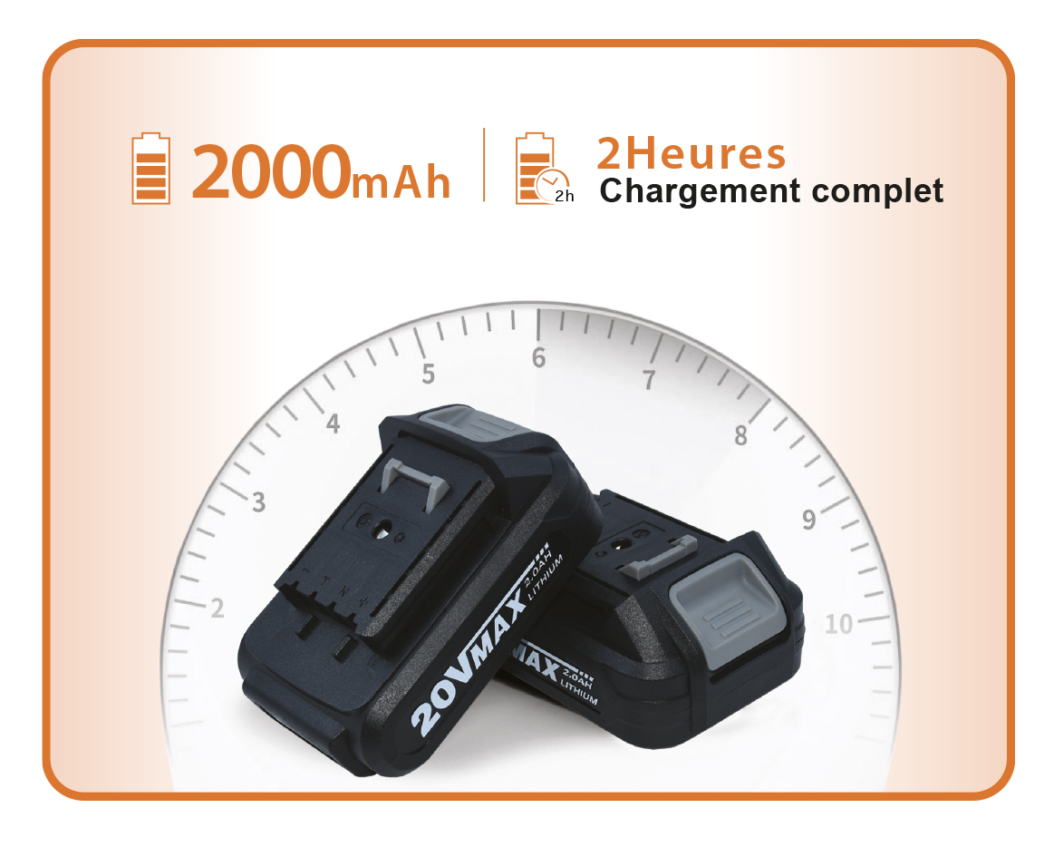 La machine intègre deux batteries lithium-ion à 20V rechargeables haute capacité, assurant une autonomie prolongée grâce à une utilisation alternée.